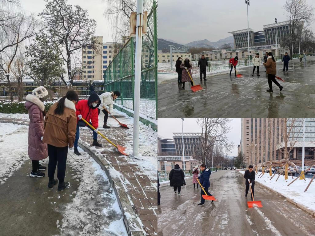 活动由李博部长负责组织,并给部内教职员工部署教学11号楼、行知广场两侧及地下通道入口两侧等相关任务。大家纷纷行动、积极参与,戴上手套,握紧铁锹,不畏冷风,认真地清扫校园道路上的积雪。虽然天气寒冷,但并没有阻挡住大家的热情,大家齐心协力,干得热火朝天。